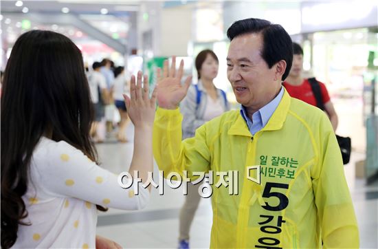 강운태 광주시장 후보가 25일 광주시 서구 광천동 유스퀘어 상가를 돌다 지나가는 젊은 여성 유권자들과 '하이파이브'를 나누며 자신의 기호 5번을 자연스레 알리고 있다. 사진제공=강운태 후보측
