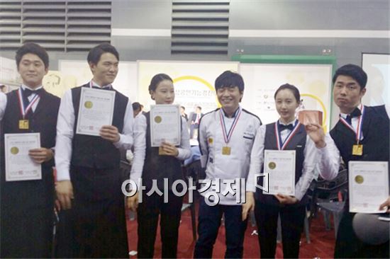 호남대가 ‘2014국제요리경연대회’ 서비스부문에서 ‘금상’을 수상했다.송재종, 조수빈, 나단비, 김성수 교수, 김도하, 김유창 씨등 수상자들이 기념촬영을 하고있다. [왼쪽부터]<br />