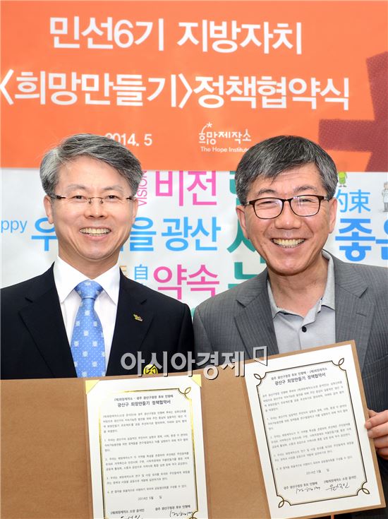"25일 정책협약식… “광산구만의 혁신적인 정책 개발·실현 할 것”[아시아경제 노해섭 기자]민형배 새정치민주연합 광산구청장 후보가 희망제작소(소장 윤석인)가 추천하는 ‘우리지역의 희망후보’로 선정되어 25일 정책협약식을 가졌다.희망제작소는 “주민참여를 토대로 안전하고 행복한 지역사회를 만들고, 사회적경제와 마을만들기를 통해 지역공동체를 활성화시키며, 소통과 공감으로 지역사회를 통합하는 적임자로서 민형배 후보를 선정했다”고 밝혔다. 민형배 후보는 “광산구 주민들의 자치 역량과 희망제작소의 정책 전문성이 결합한다면 보다 광산구만의 혁신적인 정책을 개발·실현할 수 있을 것”이라고 밝혔다.희망제작소는 지역별 특성에 기초한 정책개발과 풀뿌리 자치를 실현할 민선6기 지방자치단체장 후보를 ‘희망 후보’로 선정했다. 광주에서는 민형배 광산구청장·최영호 남구청장이 뽑혔다.박원순 서울시장이 지난 2006년에 설립한 희망제작소는 ‘21세기 新실학운동’을 슬로건으로 내걸고 지역에 대한 정책연구와 지원을 위해 출범한 시민참여형 연구소이다. 노해섭 기자 nogary@<ⓒ세계를 보는 창 경제를 보는 눈, 아시아경제(www.asiae.co.kr) 무단전재 배포금지>