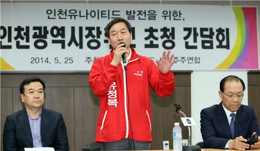 유정복 새누리당 인천시장 후보가 25일 오후 3시 아레나파크 축구경기장에서 인천유나이티드 시민주주연합 및 청년서포터즈 간담회 자리에 황우여 의원과 함께 참석해 발언을 하고 있다. <br /> <br />