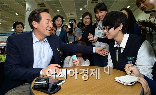 [아시아경제 윤동주 기자] 정몽준 새누리당 서울시장 후보가 26일 서울 강남구 코엑스에서 열린 '청년일자리 박람회'를 찾아 학생들과 이야기를 나누고 있다.윤동주 기자 doso7@asiae.co.kr<ⓒ세계를 보는 창 경제를 보는 눈, 아시아경제(www.asiae.co.kr) 무단전재 배포금지>