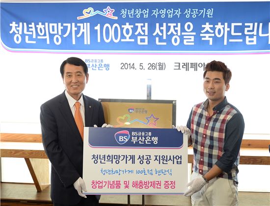 ▲부산은행은 26일 '청년희망가게' 100호점으로 부산 남포동에 위치한 크레페 전문점 '크레페 아인스'를 선정했다. 사진 왼쪽부터 성세환 BS금융그룹 회장, 정병근 크레페 아인스 대표.