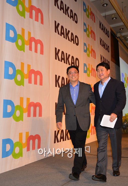 ▲이석우 카카오 대표(오른쪽)와 최세훈 다음커뮤니케이션 대표가 다음카카오 합병을 공식발표하고 기자간담회를 열었다.