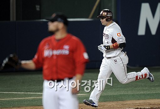 [아시아경제 김현민 기자] 27일 오후 서울 목동구장에서 열린 프로야구 SK와 넥센의 경기. 5회말 1사 3루에서 넥센 박병호가 연타석 홈런을 치고 그라운드를 돌고있다.김현민 사진기자 kimhyun81@asiae.co.kr<ⓒ세계를 보는 창 경제를 보는 눈, 아시아경제(www.asiae.co.kr) 무단전재 배포금지>