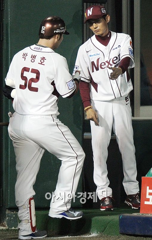 [아시아경제 김현민 기자] 27일 오후 서울 목동구장에서 열린 프로야구 SK와 넥센의 경기. 5회말 1사 3루에서 넥센 박병호가 연타석 홈런을 치고 염경엽 감독과 하이파이브하고 있다.김현민 사진기자 kimhyun81@asiae.co.kr<ⓒ세계를 보는 창 경제를 보는 눈, 아시아경제(www.asiae.co.kr) 무단전재 배포금지>