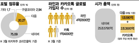 [아시아경제 조유진 기자] 다음과 카카오의 합병으로 양 사가 준비 중이던 신사업들도 줄줄이 급제동이 걸렸다. 다음카카오가 '새로운 정보기술(IT)역사를 쓰는 길'이라고 변화를 예고한 만큼 출범 이후 새판을 짜는 데 역량을 집중할 것으로 예상되기 때문이다. 중첩되는 사업을 정리하거나 시너지를 낼 수 있는 모델로 전환하는 작업에 주력하면서 일부 사업은 일정이 연기되거나 정리될 것으로 보인다. 28일 업계에 따르면 이번 합병으로 오는 6월 출시 예정이었던 카카오 뉴스 서비스와 금융서비스(뱅크월렛)에 제동이 걸릴 것으로 예상된다. 카카오는 뉴스 유통 시장 진출을 위해 지난해 초부터 뉴스 공급자와 물밑 접촉을 이어왔다. 당시 오픈 예정이었던 모바일 콘텐츠 장터 '카카오페이지'를 통해 뉴스 콘텐츠를 공급하는 방안이 논의됐던 것이다. 하지만 이번 합병으로 일정에 차질이 불가피할 것으로 보인다. 미디어 부문은 다음 카카오 협공으로 가장 큰 시너지를 낼 수 있는 분야로 꼽히는 만큼 카카오가 단독으로 출시할 가능성은 낮기 때문이다. 업계 관계자는 "지난해 초부터 뉴스 콘텐츠를 공급하는 방안이 논의됐지만 언론사 제휴·기술력 등의 문제로 지지부진했다"며 "다음의 기술력과 네트워크 등을 활용할 경우 사업모델이 전혀 다른 모습을 바뀔 수 있는 만큼 출시 일정을 미루게 될 공산이 크다"고 말했다. 특히 다음의 미디어 인프라와 카카오톡의 흥행요소가 결합할 경우 네이버가 독점하고 있는 시장 판도에도 변화의 기회가 될 것으로 업계는 보고 있다. 랭키닷컴에 따르면 4월 방문자 기준 포털뉴스 분야(PC) 점유율은 네이버 뉴스가 49.3%로 다음이 35.3%로 검색점유율(네이버 75%·다음 20%)과 비교해 격차가 크지 않다. 카카오가 다음 달 오픈 예정인 송금 서비스 '뱅크월렛카카오'도 출시 여부가 불투명하다. 카카오는 카카오톡을 통해 소액을 주고받는 송금서비스 뱅크월렛카카오를 다음 달 오픈 예정이었다. 업계 관계자는 "전자상거래 부문은 합병 시너지에 대한 기대가 큰 데다 보안문제 등으로 출시 과정이 순탄치 않았던 점도 있어 출시가 미뤄질 개연성이 있다"고 말했다.
