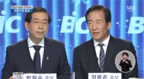 ▲정몽준 후보가 TV토론회 중 박원순 후보의 말투를 흉내내기도 했다. (사진: SBS 방송화면 캡처)