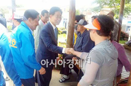 안병호 함평군수 후보 지원유세에 나선 양승조 최고위원과 안병호 함평군수 후보가 유권자들과 악수를 하면서 지지를 호소하고있다.