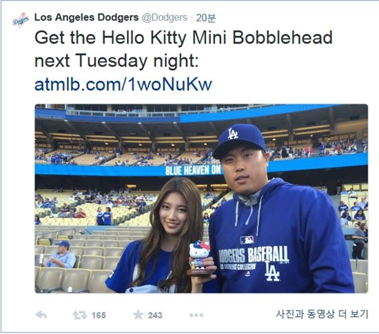 ▲시구를 마친 수지와 류현진이 다정하게 사진을 찍고 있다.(사진:LA다저스 트위터 캡처)