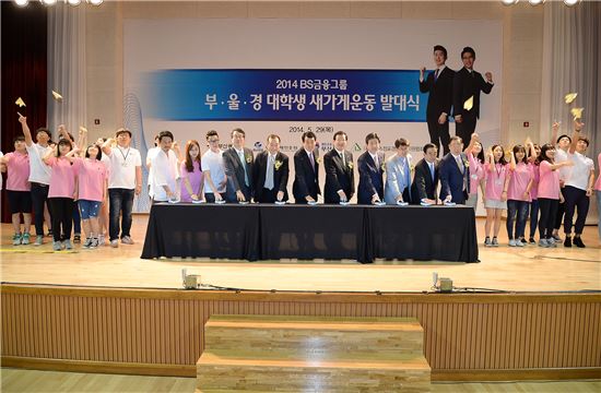 ▲성세환 BS금융그룹 회장(단상 왼쪽에서 여섯번째)이 29일 오후 부산은행 기장 연수원에서 부산광역시, 부산경제진흥원, 한국소점포경영관리지원협회와 공동주관으로 열린 '2014 BS부울경 대학생 새가게운동' 발대식에서 기념사진을 촬영하고 있다.