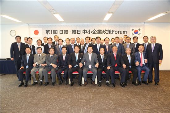 김기문 중소기업중앙회장(앞줄 오른쪽 다섯번째)이 쓰루타 긴야 일본중기중앙회장(앞줄 왼쪽 다섯번째) 등 한일포럼 관계자들과 29일 포럼을 마친 후 기념촬영을 하고 있다.