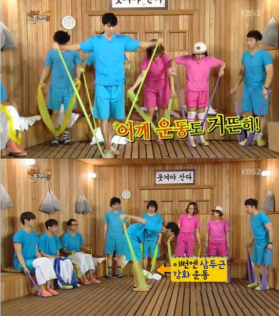 ▲차승원이 고무밴드 운동법을 소개했다.(사진:KBS2 '해피투게더3' 방송 캡처)