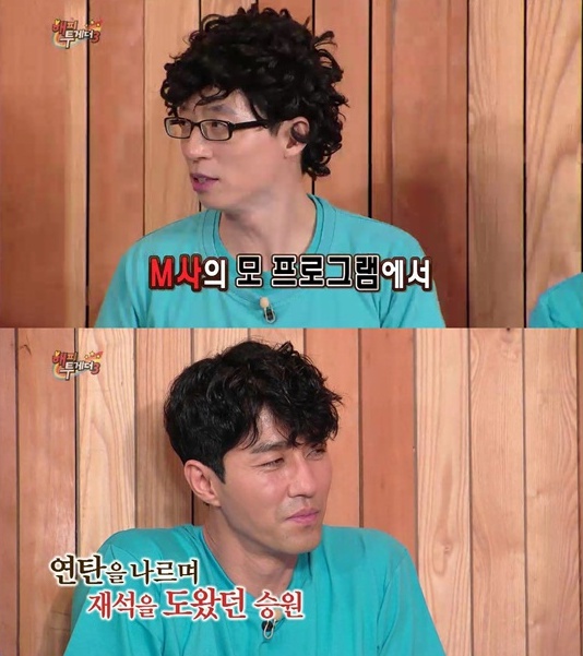 ▲유재석이 '무한도전'에서 차승원이 연탄을 나르며 도와준 것을 언급했다(사진:KBS2 '해피투게더3' 방송 캡처)
