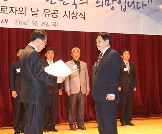 ▲ 고재길(오른쪽) 아워홈 수석 조리부장이 29일 정부세종청사에서 열린 '2014 근로자의 날 시상식'에서 방하남(왼쪽) 고용노동부 장관으로부터 산업포장을 수여받고 있다.