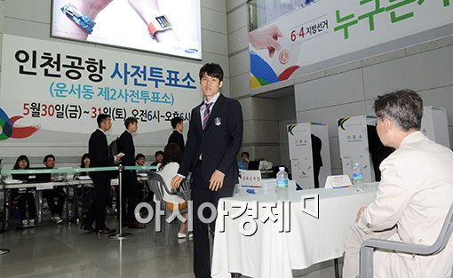 [영종도=아시아경제 김현민 기자] 2014브라질월드컵에 출전하는 축구 국가대표팀이 30일 인천국제공항을 통해 미국 플로리다주 마이애미로 향했다. 대표팀 김창수가 출국에 앞서 6·4지방선거 사전투표를 하고 있다.김현민 사진기자 kimhyun81@asiae.co.kr<ⓒ세계를 보는 창 경제를 보는 눈, 아시아경제(www.asiae.co.kr) 무단전재 배포금지>