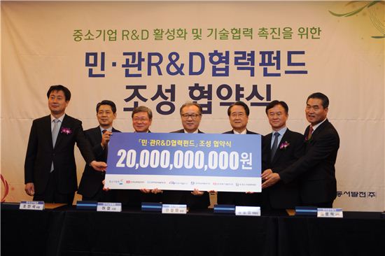 한정화 중소기업청장(가운데)이 조인국 한국서부발전 사장(왼쪽 두번째) 등 발전 5사 관계자와 유장희 동반성장위원장(오른쪽 세번째)과 민관 R&D 협력펀드 조성 협약식 직후 기념촬영을 하고 있다.
