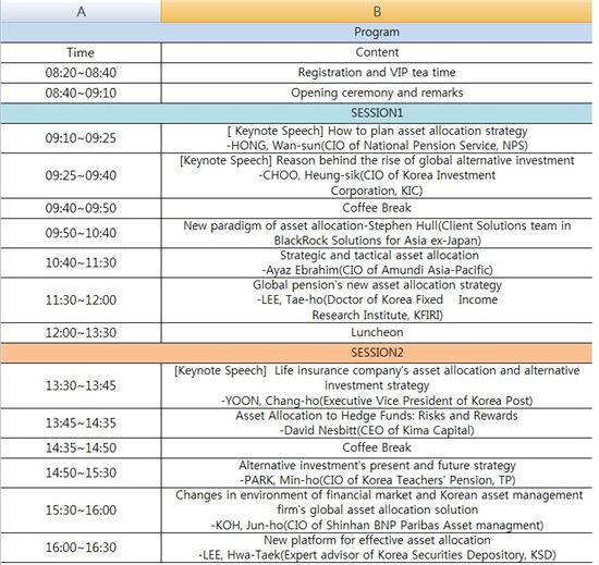 Invitation to 'The First Global Asset Allocation Forum'As investment target is getting more specialized and diversified, financial companies concern of returning clients profit that surpass money market rate is getting deeper.If there is a product that targets for more that 5% profit annually, they say it would collect all the floating money.This is why effective asset allocation from stock, bond, foreign currency to derivatives is becoming a 'big issue' nowadays.Also, facing super aging society, building portfolio which targets for profit rate that exceed market profit rate is urgent problem for every member of our society. Therefore, on June 10, Asia Business daily is holding a forum called 'The First Global Asset Allocation Forum' to find out advanced asset allocation strategy.Major institutional investors like National Pension Service, Teachers Pension(TP), KIC(Korea Investment Corporation) and Koreapost will share their asset allocation know-hows and will have an opportunity to learn global asset management companies' asset allocation strategies. BlackRock, one of the world's biggest asset management firms which holds unrivaled know-hows in asset allocation strategy and Europe's number one asset management firm, Amundi's CIO will be the lecturer and introduce 'The golden ratio strategy'.▲Date: June 10(Tuesday), 2014 9 a.m. to 5 p.m.▲Venue: Seoul, Yeouido, KOFIA(Korea Financial Investment Association) Bull's hall(3rd floor)▲Organizers: Asia Business Daily, ASIA PAX▲Sponsors: FSC(Financial Service Commission, FSS(Financial Supervisory Service), KRX(Korea Exchange), KSD(Korea Securities Depository), KOFIA(Korea Financial Investment Association), NPS(National Pension Service), KIC(Korea Investment Corporation), KCMI(Korea Capital Market Institute)▲Fee: 300,000 KRW(Lunch included)※ Registration before May 30 will be free.▲Further inquiries: Asia Business Daily Securities Dept.(02-2200-2081/2)(christine89@asiae.co.kr)