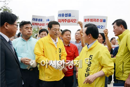 이용섭 전 광주시장 후보 지지자 수백명은 1일 오후 2시 옛 전남도청 광장에서 모임을 갖고 “새정치민주연합의 낙하산공천으로 인해 무너져가는 광주의 자존심을 지켜달라”며 시민들에게 100배로 호소했다. 이 자리에서 강운태 광주시장 후보와 이용섭 전 전후보가 악수를 하고있다. <br /> <br /> 이 전 후보 지지자들은 이날 “안철수·김한길은 심야에 밀실공천, 낙하산공천을 함으로써 광주의 명예를 짓밟고 광주시민의 자존심을 심각하게 훼손했다”며 “광주를 정치적 희생물로 삼으려는 반민주적 폭거에 대항해 모든 시민이 일치단결해서 광주를 살리자”고 말했다.<br /> <br />