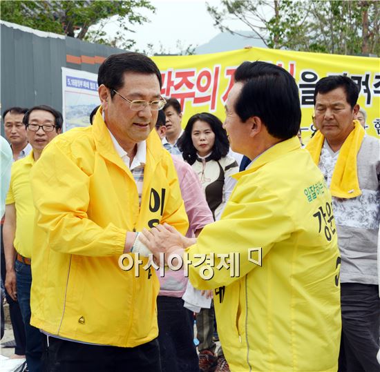 이용섭 전 광주시장 후보 지지자 수백명은 1일 오후 2시 옛 전남도청 광장에서 모임을 갖고 “새정치민주연합의 낙하산공천으로 인해 무너져가는 광주의 자존심을 지켜달라”며 시민들에게 100배로 호소했다. <br /> <br /> 강운태 후보와 이용섭 전후보가 악수를 하면서 서로 격려하고있다. <br /> <br /> 이 전 후보 지지자들은 이날 “안철수·김한길은 심야에 밀실공천, 낙하산공천을 함으로써 광주의 명예를 짓밟고 광주시민의 자존심을 심각하게 훼손했다”며 “광주를 정치적 희생물로 삼으려는 반민주적 폭거에 대항해 모든 시민이 일치단결해서 광주를 살리자”고 말했다.<br /> <br />