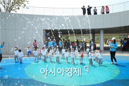 순천만정원 습지센터 물놀이장에서 어린이들이 더위를 식히고 있다.