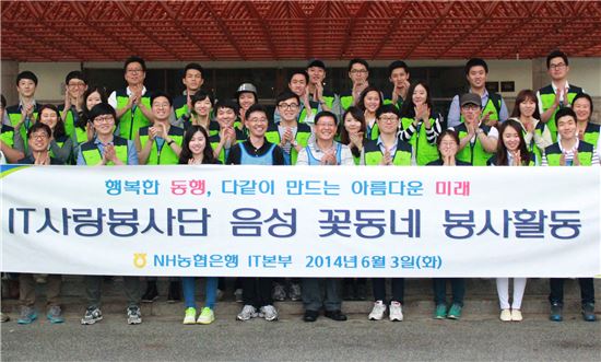 ▲농협은행 'IT사랑 봉사단' 80명은 3일 충북 음성 '꽃동네'를 찾아 일일 봉사활동을 펼쳤다.