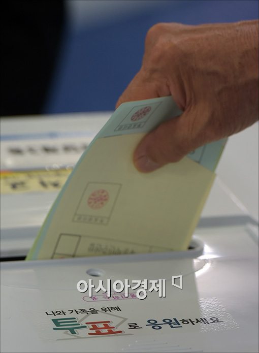 ▲제6회 전국동시지방선거 4일 오전 6시부터 시작된 가운데 투표소에서 한 유권자가 투표를 마치고 기표지를 투표함에 넣고 있다.<br />