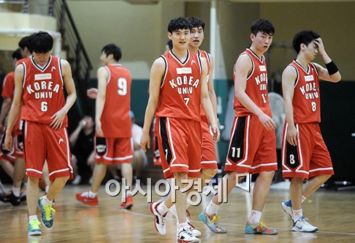 [아시아경제 김현민 기자] 4일 서울 종로구 경복고등학교 체육관에서 열린 2014 대학농구리그 고려대와 명지대의 경기에서 고려대 이동엽(가운데)과 선수들이 코트로 들어서고 있다. 결과는 77-51 고려대 승.김현민 사진기자 kimhyun81@asiae.co.kr<ⓒ세계를 보는 창 경제를 보는 눈, 아시아경제(www.asiae.co.kr) 무단전재 배포금지>