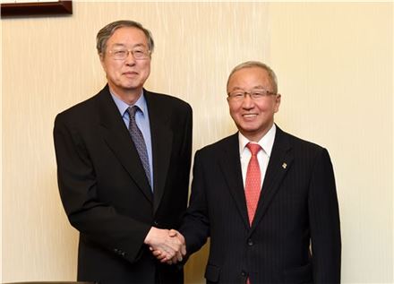 현오석 부총리 겸 기획재정부 장관이 4일 중국 북경 조어대에서 열린 '한-중 재무장관회의'에 참석, 러우 지웨이 중국 재무장관과 악수를 하고 있다.