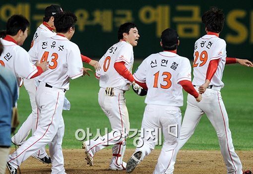[인천=아시아경제 김현민 기자] 4일 인천 문학구장에서 열린 프로야구 두산와 SK의 경기. 9회말 무사 만루 5-7로 뒤진 상황에서 SK 김강민이 역전 끝내기 3타점 2루타를 치고 동료들과 기쁨을 나누고 있다.김현민 사진기자 kimhyun81@asiae.co.kr<ⓒ세계를 보는 창 경제를 보는 눈, 아시아경제(www.asiae.co.kr) 무단전재 배포금지>