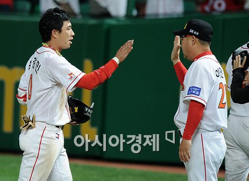 [인천=아시아경제 김현민 기자] 4일 인천 문학구장에서 열린 프로야구 두산와 SK의 경기. 9회말 무사 만루 5-7로 뒤진 상황에서 SK 김강민이 역전 끝내기 3타점 2루타를 치고 이만수 감독과 기쁨을 나누고 있다.김현민 사진기자 kimhyun81@asiae.co.kr<ⓒ세계를 보는 창 경제를 보는 눈, 아시아경제(www.asiae.co.kr) 무단전재 배포금지>
