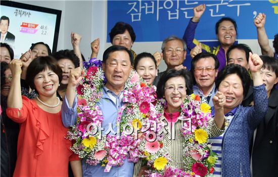 제6회 전국동시지방선거가 치러진 4일 오후 안병호 새정치민주연합 전남 함평군수 후보가 당선이 유력시 되자 선거캠프에서 지지자들과 함께 환호하고 있다. 사진제공=안병호 후보 선거캠프<br />