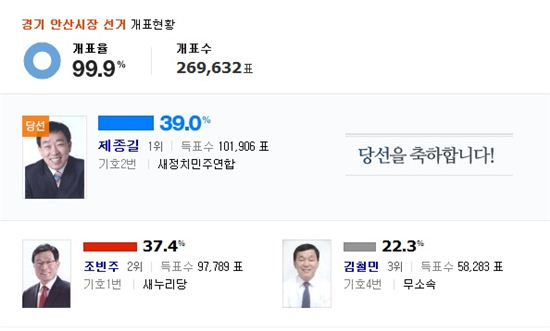 ▲경기 안산시장은 새정치민주연합의 제종길 후보가 당선됐다. (사진:NAVER 개표현황 캡처)