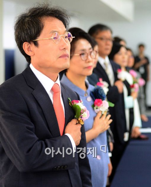[아시아경제 최우창 기자]조희연 서울시 교육감 당선인이 5일 종로구 서울시선거관리위원회에서 열린 6.4지방선거 당선증 교부식에 참석, 비례대표 당선인들과 국민의례를 하고 있다.최우창 기자 smicer@asiae.co.kr<ⓒ세계를 보는 창 경제를 보는 눈, 아시아경제(www.asiae.co.kr) 무단전재 배포금지>