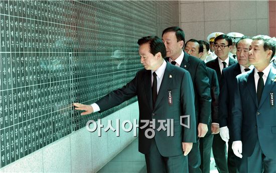 제59회 현충일을 맞아 6일 광주공원 현충탑 일원에서 강운태 광주시장,윤장현 광주시장 당선자, 장휘국 광주시교육감 당선자 등 유가족들이 참석한 가운데 조국을 위해 헌신·희생한하신 순국선열과 호국영령의 명복을 기원하는 추념식이 거행됐다. 사진제공=광주시
