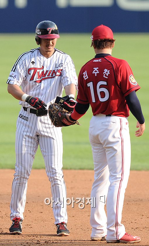 [아시아경제 김현민 기자]6일 서울 잠실구장에서 열린 프로야구 KIA 타이거즈와 LG 트윈스의 경기. 3회말 1사에서 LG 박용택이 2루타를 치고 출루한 뒤 보호장비를 KIA 1루수 김주찬에게 건내고 있다.김현민 사진기자 kimhyun81@asiae.co.kr<ⓒ세계를 보는 창 경제를 보는 눈, 아시아경제(www.asiae.co.kr) 무단전재 배포금지>