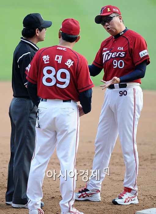 [아시아경제 김현민 기자]6일 서울 잠실구장에서 열린 프로야구 KIA 타이거즈와 LG 트윈스의 경기. 4회말 1사 2,3루에서 LG 김용의의 1루수 앞 땅볼 때 1루 베이스 터치 여부를 놓고 KIA 선동열 감독이 심판진에게 어필하고 있다.김현민 사진기자 kimhyun81@asiae.co.kr<ⓒ세계를 보는 창 경제를 보는 눈, 아시아경제(www.asiae.co.kr) 무단전재 배포금지>