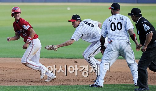 [아시아경제 김현민 기자]6일 서울 잠실구장에서 열린 프로야구 KIA 타이거즈와 LG 트윈스의 경기. 5회초 1사 2루 KIA 이대형의 3루수 앞 땅볼때 협살에 걸린 2루주자 강한울이 LG 김용의에게 태그아웃되고 있다.김현민 사진기자 kimhyun81@asiae.co.kr<ⓒ세계를 보는 창 경제를 보는 눈, 아시아경제(www.asiae.co.kr) 무단전재 배포금지>
