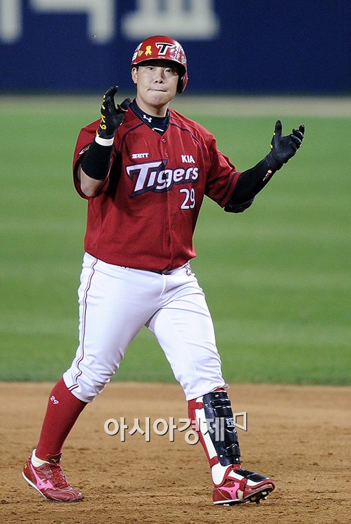 [아시아경제 김현민 기자]6일 서울 잠실구장에서 열린 프로야구 KIA 타이거즈와 LG 트윈스의 경기. 9회초 2사 1,2루에서 KIA 나지완이 추가 1타점 적시타를 치고 환호하고 있다.김현민 사진기자 kimhyun81@asiae.co.kr<ⓒ세계를 보는 창 경제를 보는 눈, 아시아경제(www.asiae.co.kr) 무단전재 배포금지>