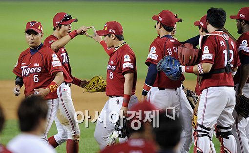 [아시아경제 김현민 기자]6일 서울 잠실구장에서 열린 프로야구 KIA 타이거즈와 LG 트윈스의 경기. KIA 이대형이 5-3 승리를 확정짓고 동료들과 기뻐하고 있다.김현민 사진기자 kimhyun81@asiae.co.kr<ⓒ세계를 보는 창 경제를 보는 눈, 아시아경제(www.asiae.co.kr) 무단전재 배포금지>