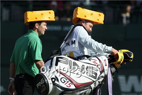 마크 윌슨(왼쪽)과 캐디 크리스 존스가 2011년 피닉스오픈에서 NFL 그린베이 패커스팀 응원단의 상징인 치즈 모자를 쓰고 경기를 하는 장면이다. 사진=Getty images/멀티비츠