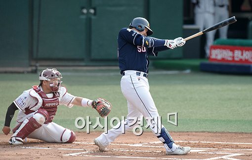 [아시아경제 김현민 기자]7일 서울 목동구장에서 열린 프로야구 두산 베어스와 넥센 히어로즈의 경기. 1회초 무사 1,2루에서 두산 김현수가 선취 1타점 중전 적시타를 치고 있다.김현민 사진기자 kimhyun81@asiae.co.kr<ⓒ세계를 보는 창 경제를 보는 눈, 아시아경제(www.asiae.co.kr) 무단전재 배포금지>