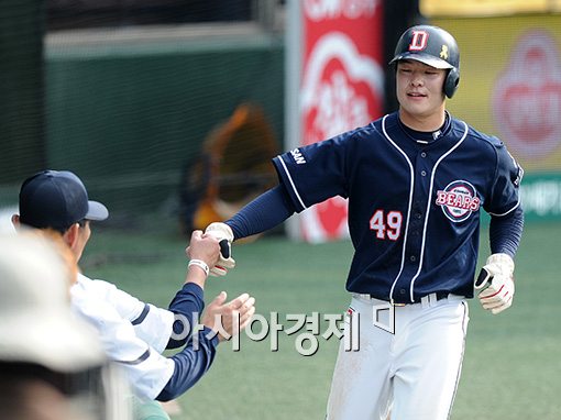 [아시아경제 김현민 기자]7일 서울 목동구장에서 열린 프로야구 두산 베어스와 넥센 히어로즈의 경기. 1회초 무사 1,2루에서 두산 김현수의 선취 1타점 중전 적시타 때 득점을 올린 2루주자 민병헌이 동료들의 환영을 받고 있다.김현민 사진기자 kimhyun81@asiae.co.kr<ⓒ세계를 보는 창 경제를 보는 눈, 아시아경제(www.asiae.co.kr) 무단전재 배포금지>
