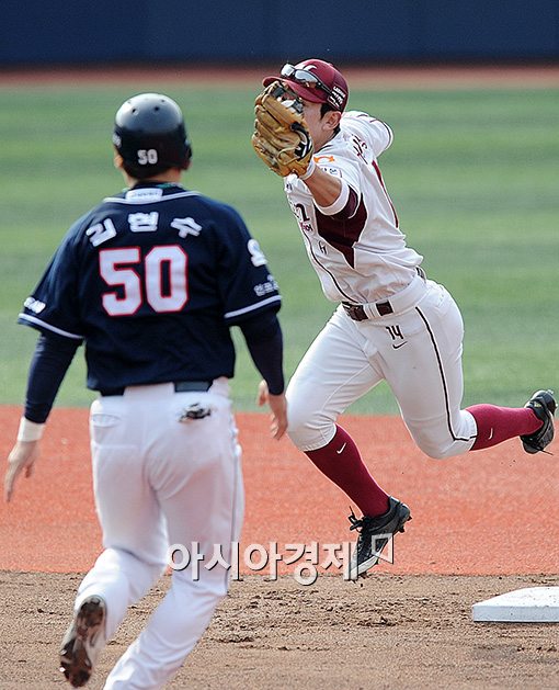 [아시아경제 김현민 기자]7일 서울 목동구장에서 열린 프로야구 두산 베어스와 넥센 히어로즈의 경기. 1회초 무사 1,2루에서 두산 칸투의 3루 땅볼때 넥센 2루수 서건창이 1루주자 김현수를 포스아웃시키고 있다.김현민 사진기자 kimhyun81@asiae.co.kr<ⓒ세계를 보는 창 경제를 보는 눈, 아시아경제(www.asiae.co.kr) 무단전재 배포금지>