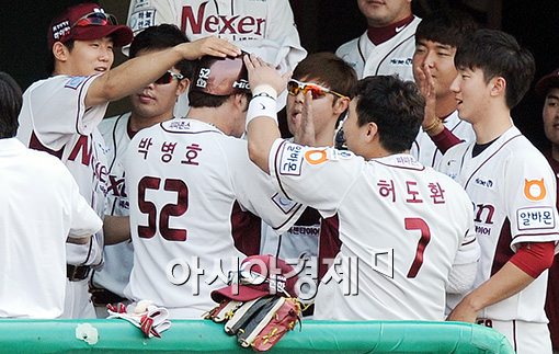 [아시아경제 김현민 기자]7일 서울 목동구장에서 열린 프로야구 두산 베어스와 넥센 히어로즈의 경기, 3회말 1사 2,3루에서 넥센 박병호가 역전 3점 홈런을 치고 동료들의 열렬한 환영을 받고 있다.김현민 사진기자 kimhyun81@asiae.co.kr<ⓒ세계를 보는 창 경제를 보는 눈, 아시아경제(www.asiae.co.kr) 무단전재 배포금지>