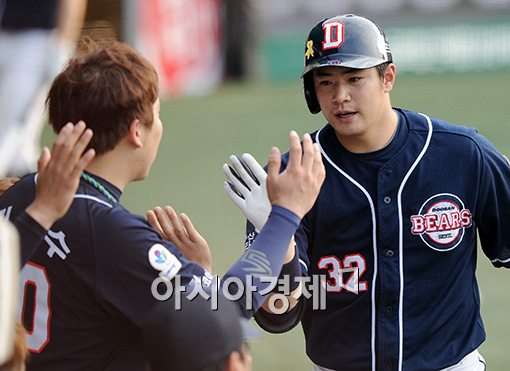 [아시아경제 김현민 기자]7일 서울 목동구장에서 열린 프로야구 두산 베어스와 넥센 히어로즈의 경기, 4회초 두산 선두타자 김재환이 넥센 선발 밴헤켄을 상대로 우중월 솔로홈런을 치고 동료들의 환영을 받고 있다.김현민 사진기자 kimhyun81@asiae.co.kr<ⓒ세계를 보는 창 경제를 보는 눈, 아시아경제(www.asiae.co.kr) 무단전재 배포금지>