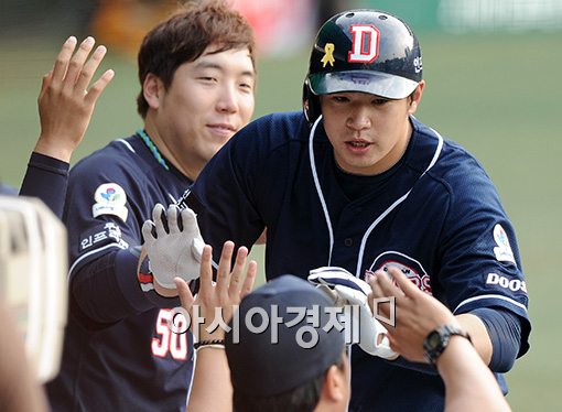 [아시아경제 김현민 기자]7일 서울 목동구장에서 열린 프로야구 두산 베어스와 넥센 히어로즈의 경기, 4회초 두산 선두타자 김재환이 넥센 선발 밴헤켄을 상대로 우중월 솔로홈런을 치고 동료들의 환영을 받고 있다.김현민 사진기자 kimhyun81@asiae.co.kr<ⓒ세계를 보는 창 경제를 보는 눈, 아시아경제(www.asiae.co.kr) 무단전재 배포금지>