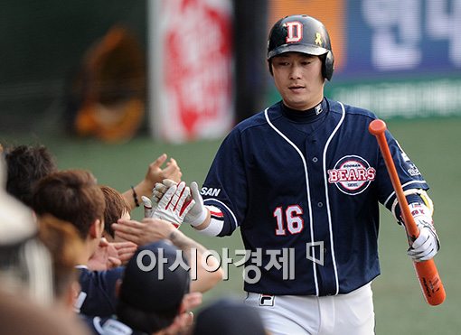 [아시아경제 김현민 기자]7일 서울 목동구장에서 열린 프로야구 두산 베어스와 넥센 히어로즈의 경기, 6회초 1사에서 두산 이원석이 넥센 선발 밴헤켄을 상대로 좌중월 솔로홈런을 치고 동료들의 환영을 받고 있다.김현민 사진기자 kimhyun81@asiae.co.kr<ⓒ세계를 보는 창 경제를 보는 눈, 아시아경제(www.asiae.co.kr) 무단전재 배포금지>