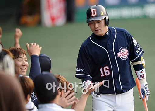 [아시아경제 김현민 기자]7일 서울 목동구장에서 열린 프로야구 두산 베어스와 넥센 히어로즈의 경기, 6회초 1사에서 두산 이원석이 넥센 선발 밴헤켄을 상대로 좌중월 솔로홈런을 치고 동료들의 환영을 받고 있다.김현민 사진기자 kimhyun81@asiae.co.kr<ⓒ세계를 보는 창 경제를 보는 눈, 아시아경제(www.asiae.co.kr) 무단전재 배포금지>