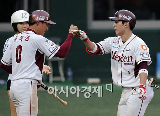 [아시아경제 김현민 기자]7일 서울 목동구장에서 열린 프로야구 두산 베어스와 넥센 히어로즈의 경기, 6회말 2사 2,3루에서 넥센 서건창이 재역전 3점 홈런을 치고 김하성과 하이파이브하고 있다.김현민 사진기자 kimhyun81@asiae.co.kr<ⓒ세계를 보는 창 경제를 보는 눈, 아시아경제(www.asiae.co.kr) 무단전재 배포금지>