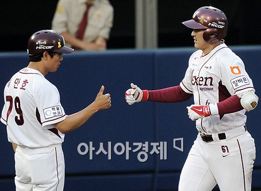 [아시아경제 김현민 기자]7일 서울 목동구장에서 열린 프로야구 두산 베어스와 넥센 히어로즈의 경기, 7회말 넥센 선두타자 유한준이 솔로홈런을 치고 최만호 코치와 하이파이브를 하고 있다.김현민 사진기자 kimhyun81@asiae.co.kr<ⓒ세계를 보는 창 경제를 보는 눈, 아시아경제(www.asiae.co.kr) 무단전재 배포금지>